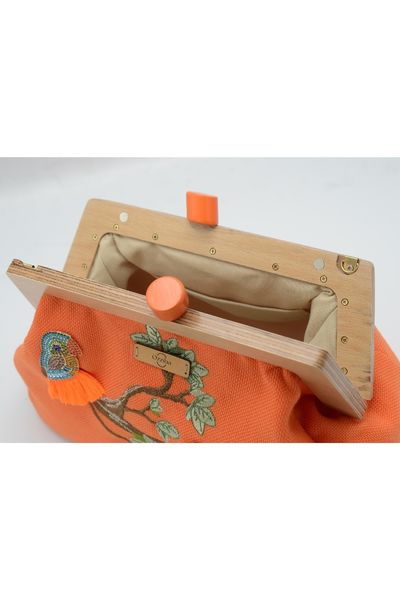 Kuş Aksesuarlı Nakışlı Ahşap Burslu Turuncu Çanta ile şıklığı yakalayın! Doğal ahşap malzemeden üretilen bu çanta, tarzınıza tarz katıyor.